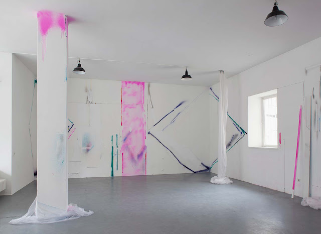 In Simone Lanzenstiels Wand- und Raummalereien erweitert sich die Malerei in den Raum hinein. Farbige Latten, an Wänden lehnend oder zwischen Decke und Boden gespannt, und auf dem Boden liegende bemalte Platten lösen die Malerei von der Wand und setzen sie als Zeichnung im Raum fort.
